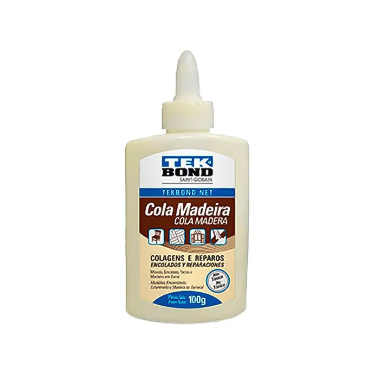 A Cola de Madeira Tekbond é um adesivo à base de copolímero de acetato de polivinila, desenvolvido para colagens e reparos em móveis, tacos, encaixes e montagens de conjuntos de madeira. Apresenta excelente adesão a substratos porosos como madeira, papelão, feltro, couro, tecido, concreto e têxteis. Deve ser aplicada de forma uniforme em uma das superfícies, com união e prensagem antes da secagem. A cura total ocorre entre 24 e 48 horas, dependendo das condições de aplicação. Possui viscosidade entre 30.000 e 60.000 cps, pH entre 6,00 e 8,00, e é indicada para uso entre 5°C e 45°C.